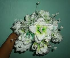 - goma eva de color rojo y verde, los pístilos están hechos con porcelana y un toque de brillo, hilo de color verde, pistola encoladora, cinta engomada verde, alambre de floristeria, Por cada flor necesitamos hacer 5 pétalos y 2 hojas. Los pétalos están moldeados con el frisador de orquidea y para realizarlo utilice el formato del pétalo de rosa, y la hoja esta moldeada con el frisador de la estrella federal.